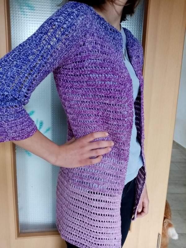 Die Jacke Eleonora wird einmal von oben nach unten gehäkelt.