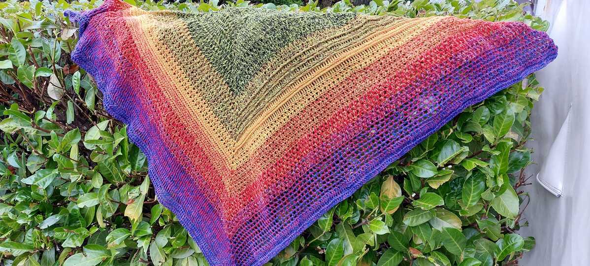 Ein Dreieckstuch mit verschiedenen Mustern, die immer nur über eine Hälfte des Tuches gehen.