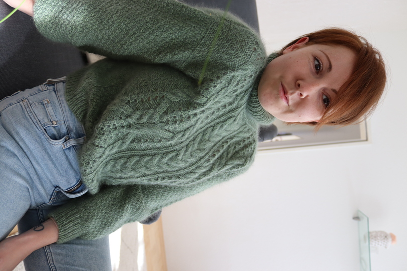 Heute stricken wir diesen wunderschönen, rustikalen Rollkragenpullover. Das interessante Zopfmuster verleiht dem Pullover etwas kuscheliges und gemütliches. Und das ist der Pullover definitiv. Die Mischung aus ecopuno und silkhair ist nämlich ein Träumchen.