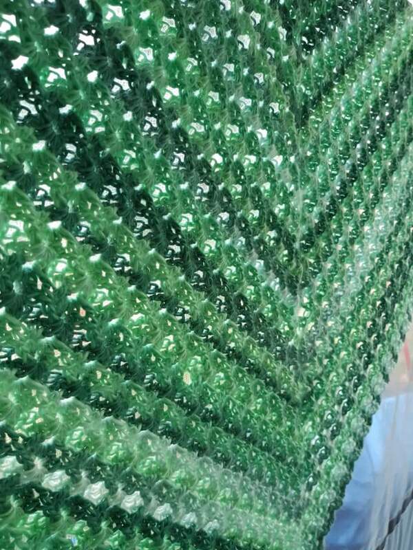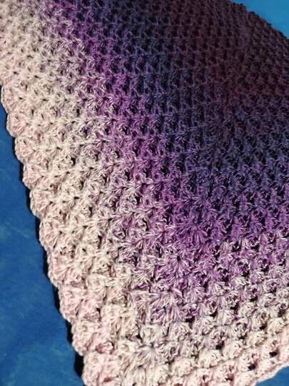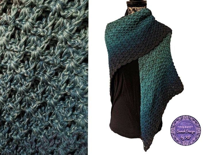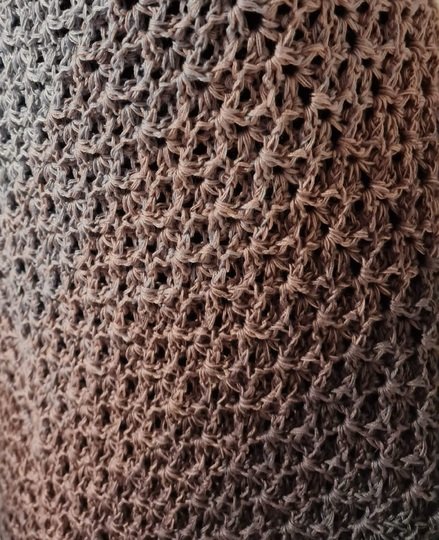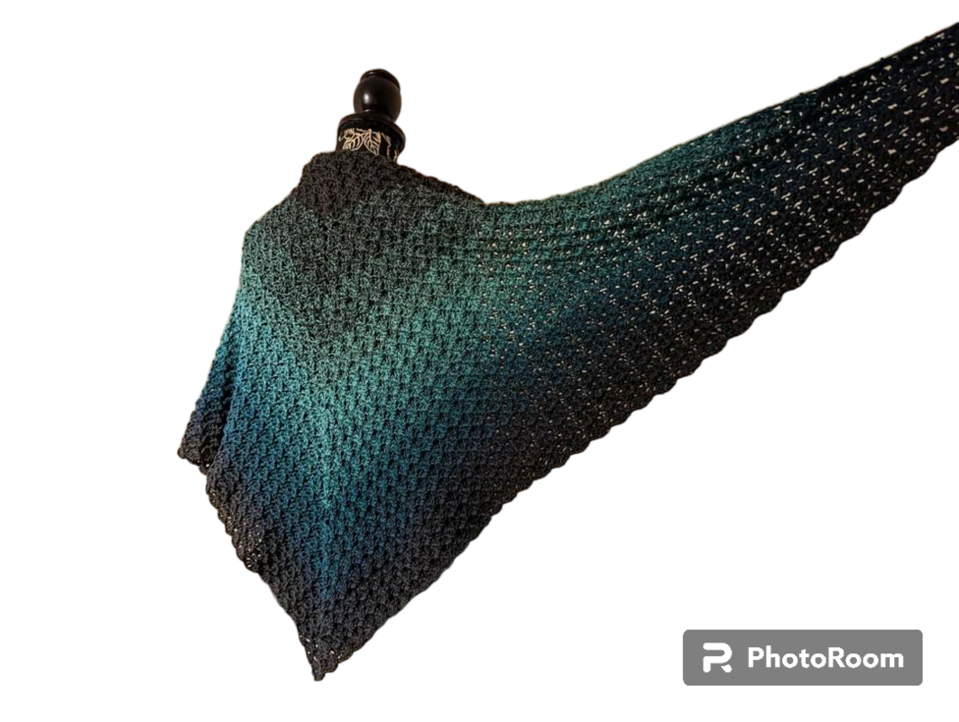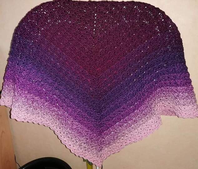 Mit einem 3-fädigen Bobbel mit 1000 m Lauflänge und mit einer Häkelnadel in Größe 3,5 gehäkelt hat das Tuch die Größe von 130 cm an der oberen langen Kante und ist 57 cm tief. Dieses Tuch kann mit jeder Wolle gehäkelt werden und auch die Größe kann nach Belieben gestaltet werden. Ein sehr dickes Garn wird wahrscheinlich eher nicht zum Muster passen.