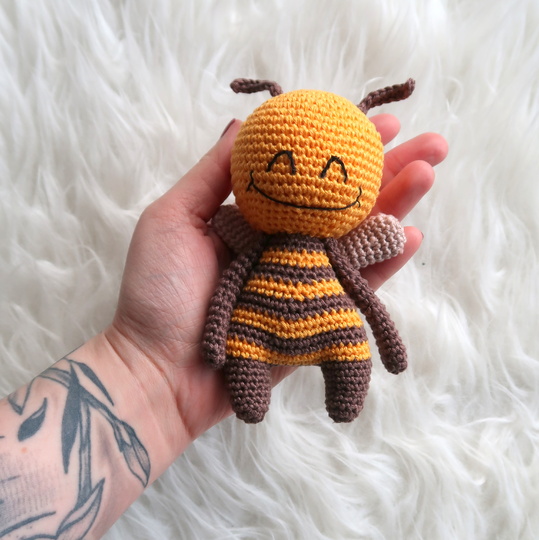 Wenn du mit Baumwolle (125m LL auf 50g) häkelst, werden Biene und Lebkuchen (ohne Haare/Fühler) ca. 13cm hoch.