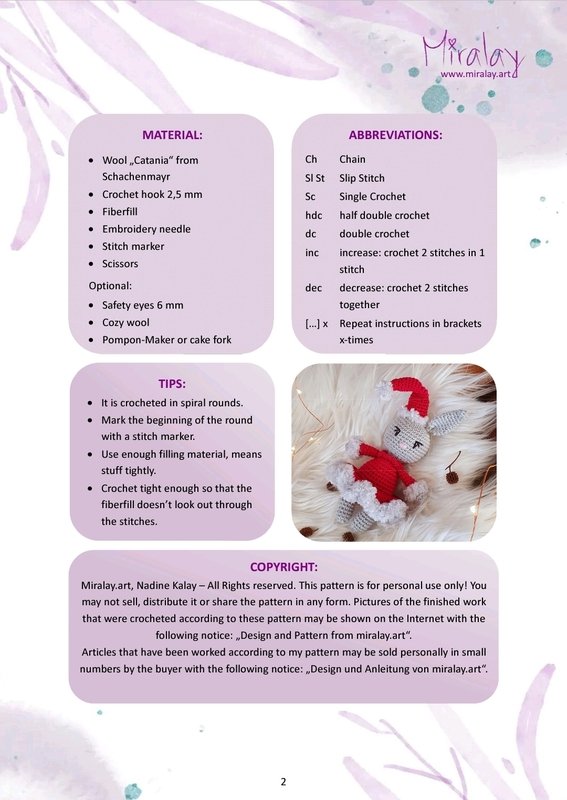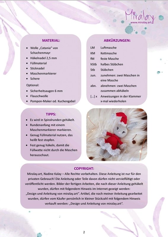 Miralay.art, Nadine Kalay – Alle Rechte vorbehalten. Diese Anleitung ist nur für den privaten Gebrauch! Die Anleitung oder Teile davon dürfen nicht vervielfältigt oder veröffentlicht werden. Bilder der fertigen Arbeiten, die nach dieser Anleitung gehäkelt wurden, dürfen mit folgendem Hinweis im Internet gezeigt werden: „Design und Anleitung von miralay.art“. Artikel, die nach meiner Anleitung gearbeitet wurden, dürfen vom Käufer persönlich in kleiner Stückzahl mit folgendem Hinweis verkauft werden: „Design und Anleitung von miralay.art“.