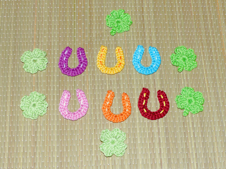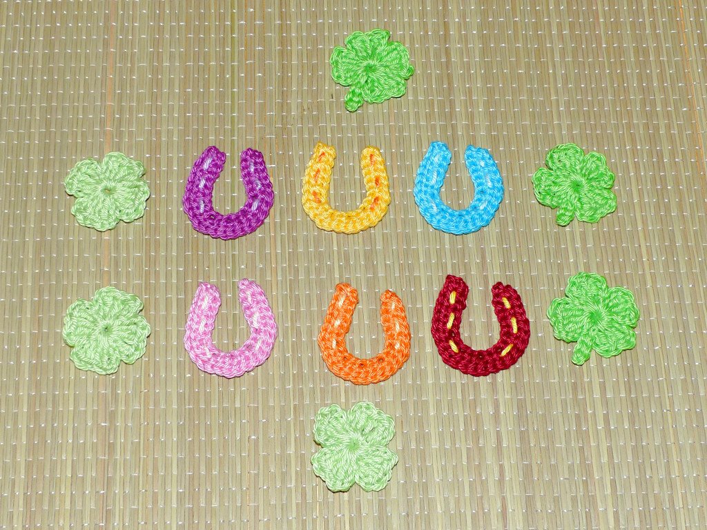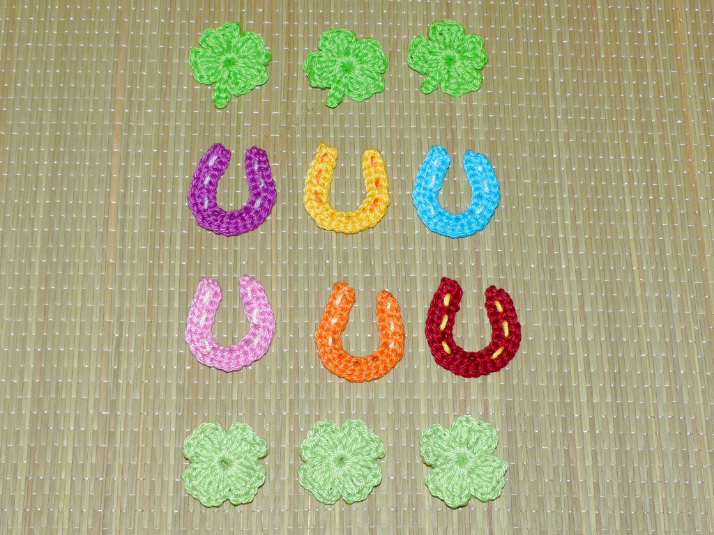 Ich beschreibe euch in der Anleitung wie die Marienkäfer, die Hufeisen und die Kleeblätter gehäkelt werden.