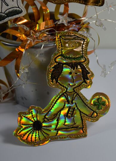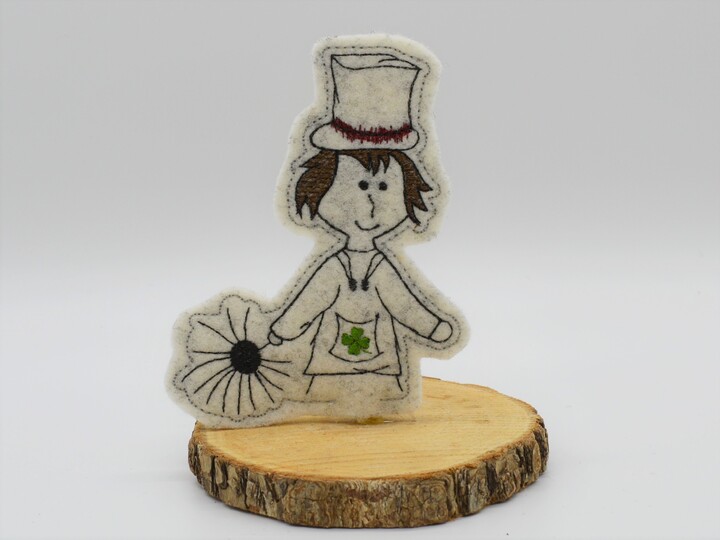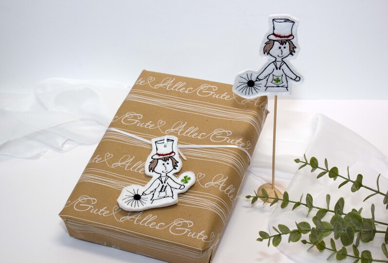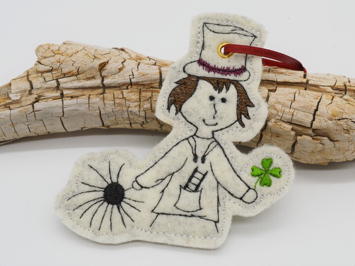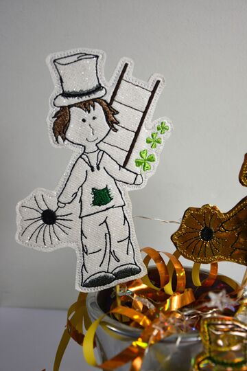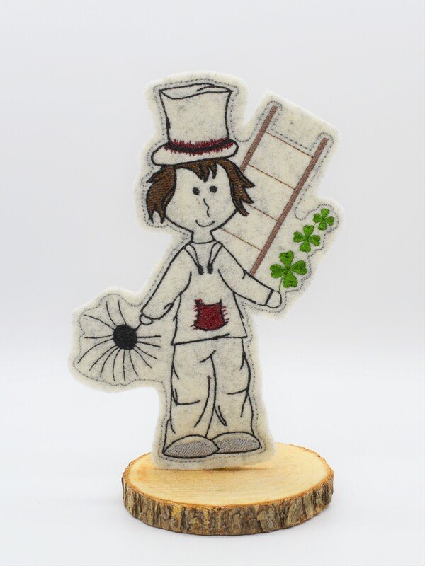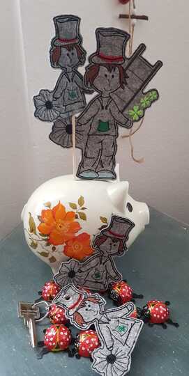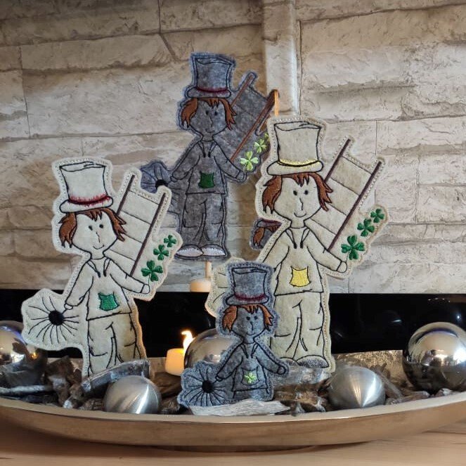Die Schornsteinfeger werden komplett im Rahmen gestickt, anschließend ausgeschnitten. An der Unterseite bleibt eine kleine Öffnung, durch die ein Stab, Spieß oder Ästchen gesteckt werden kann! Zum Aufhängen wird eine Öse mit eingestickt.