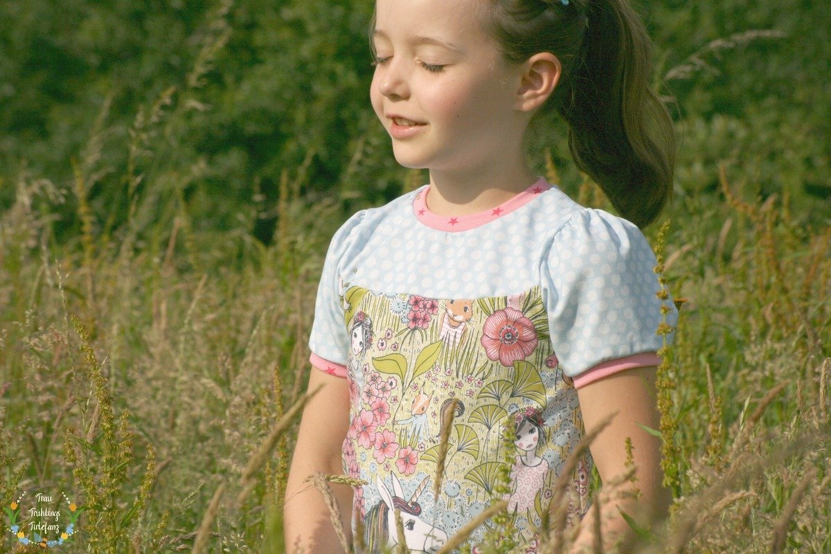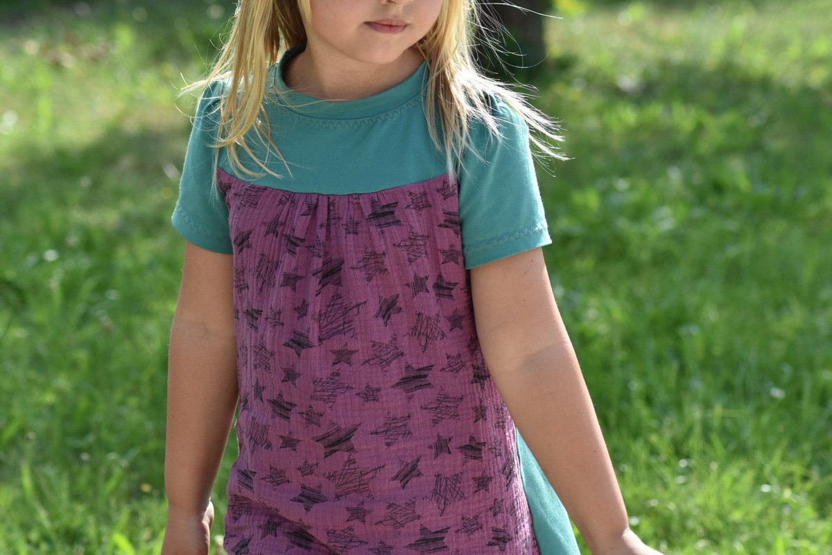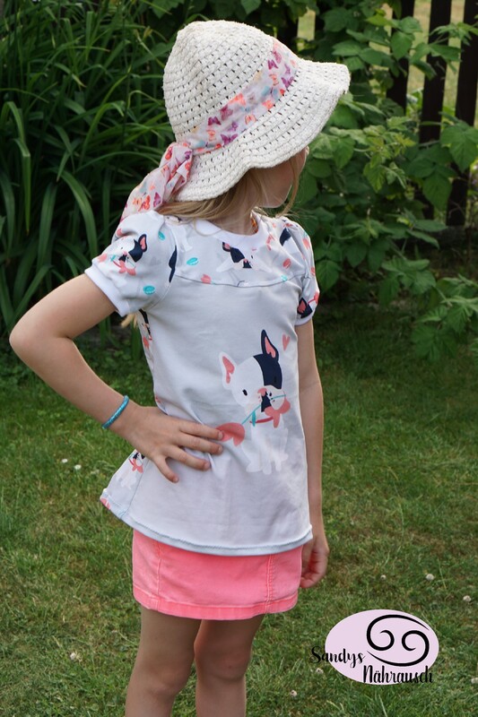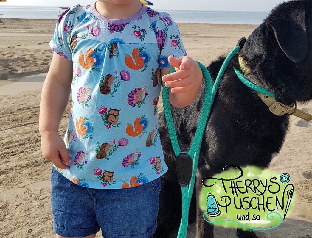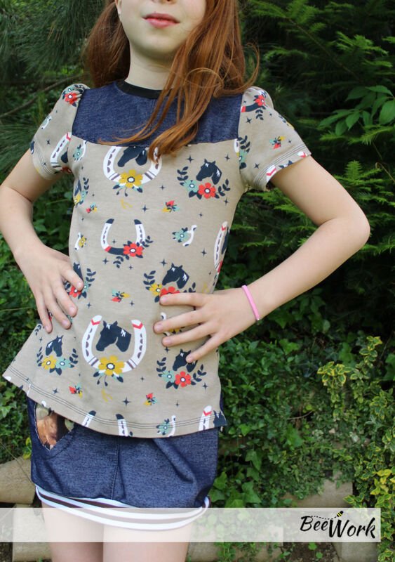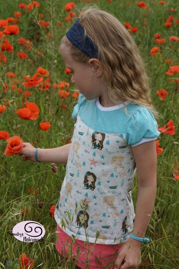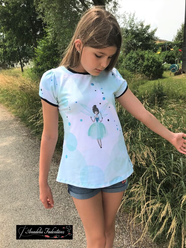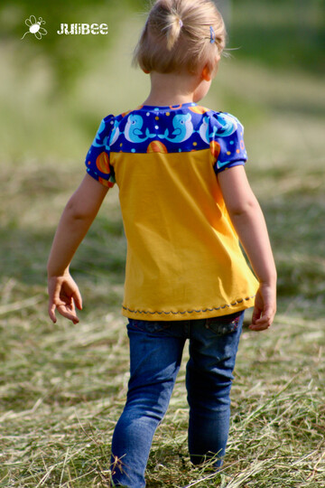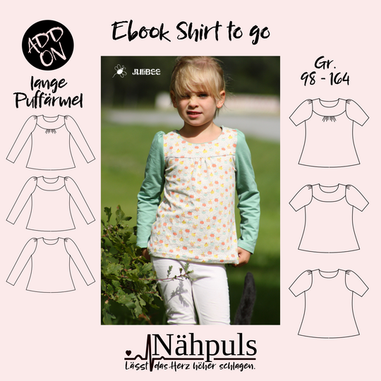 Das Schnittmuster Shirt to go ist für dehnbare Materialien konzipiert. Hervorragend eignet sich dafür Jersey und dünner Sommersweat. Es ist schmal geschnitten und in den Größen 98 bis 164 gradiert und für schmal bis normal gebaute Mädchen geeignet. Das Shirt liegt im Brustbereich eng an, aber umspielt leicht die Hüftpartie. Die Teilung kann für das Vorder-, sowie auch für das Rückteil gemacht werden. Das Ebook besitzt noch ein Extra-Schnittmuster für ein gerafftes Vorderteil, somit kann das Shirt to go mit, aber auch ohne der Raffung im Vorderteil genäht werden. Das Shirt besitzt leicht geraffte kurze, wie lange Puffärmel. Es ist auch so konzipiert, dass die Ärmel komplett weggelassen werden und nur mit einem Bündchenabschluss versehen werden können.