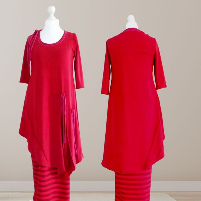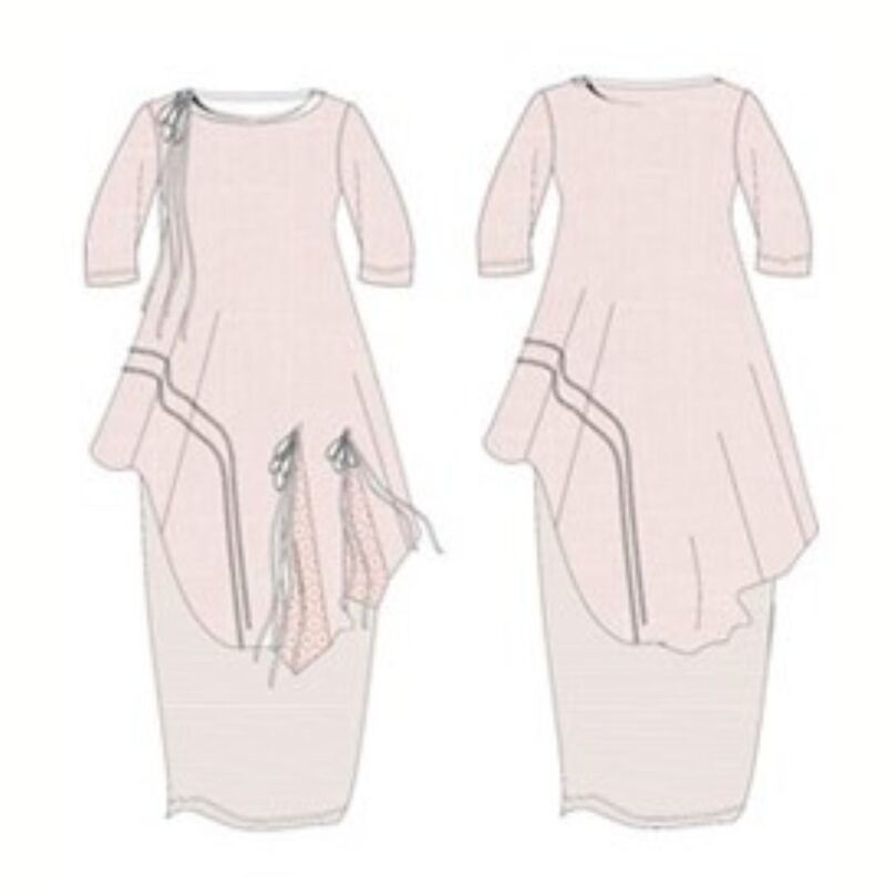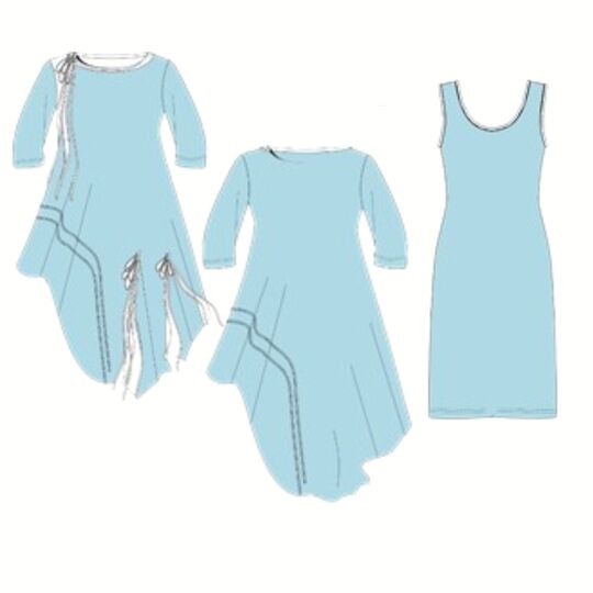 Das Schnittmuster Hazel haben wir im Lagenlook konzipiert. Es ist 2-teilig und besteht aus einem Unterkleid und Shirt. Das Kleid kann auch solo getragen werden. Das Shirt ist assymmetrisch geschnitten und mit interessanten Details verziert: Der Ausschnitt ist mit kontrastfarbenen Jerseyblenden versäubert. Ziernähte und Bindebänder tun ihr übriges. Am schönsten wird das Outfit, wenn Du Farben wählst die Ton in Ton haromonieren, so kannst Du wunderbar unifarbene Stoffe mit gemusterten Stoffen kombinieren.