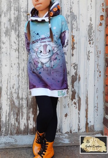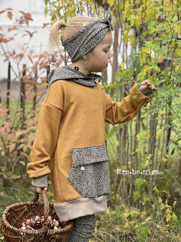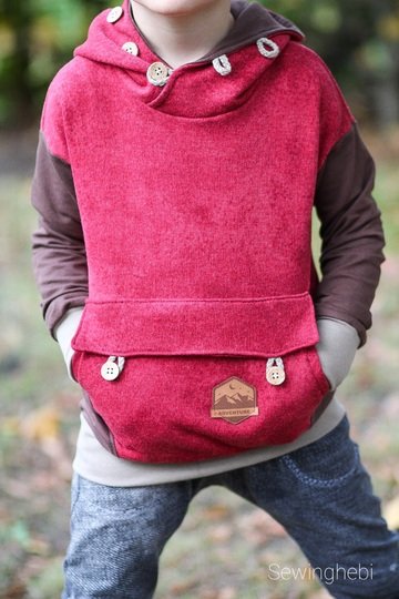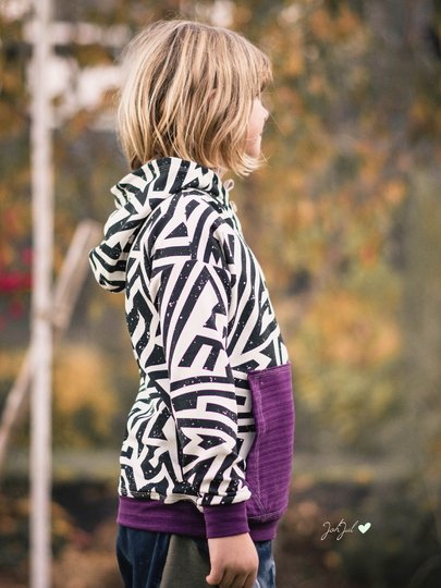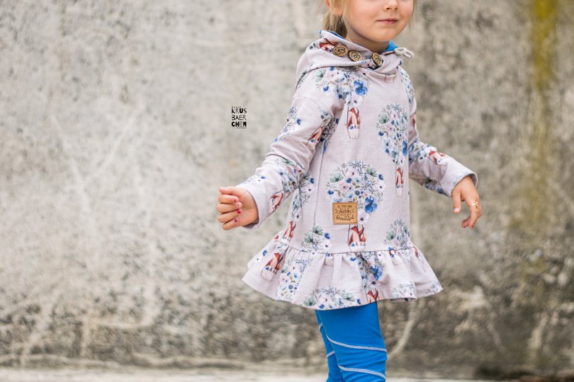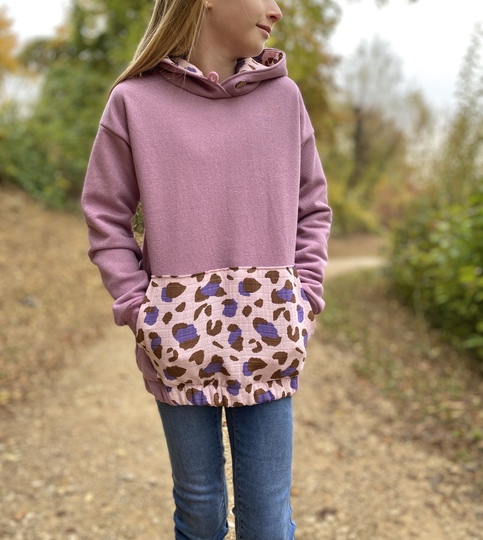 Der Hoodie wird je nach Größe mit einem 2-4cm breiten -Gummiband gesäumt und kann optional auch mit Bündchen Abschluss oder einem Volant genäht werden. Zusätzlich besteht die Möglichkeit einen Long – Hoodie mit Bündchen Abschluss oder Gummizugsaum zu nähen. Auch eine extra Kleid Variante ist dabei, welches ebenfalls locker lässig sitzt.