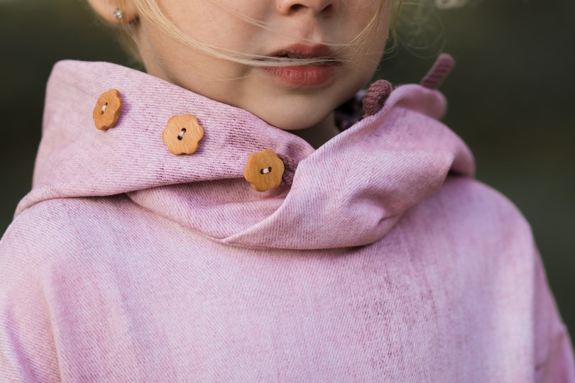 Die Kapuze wird mit drei Knöpfen versehen, mit dem untersten Knopf kann die Kapuze höher am Hals geschlossen werden, die anderen beiden sind nur zur Dekoration.