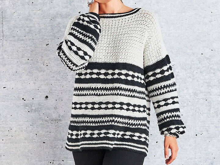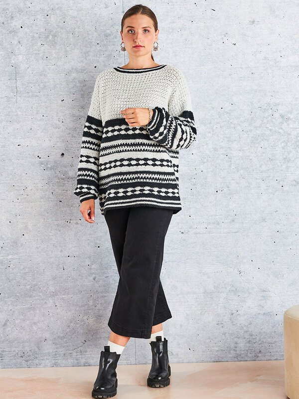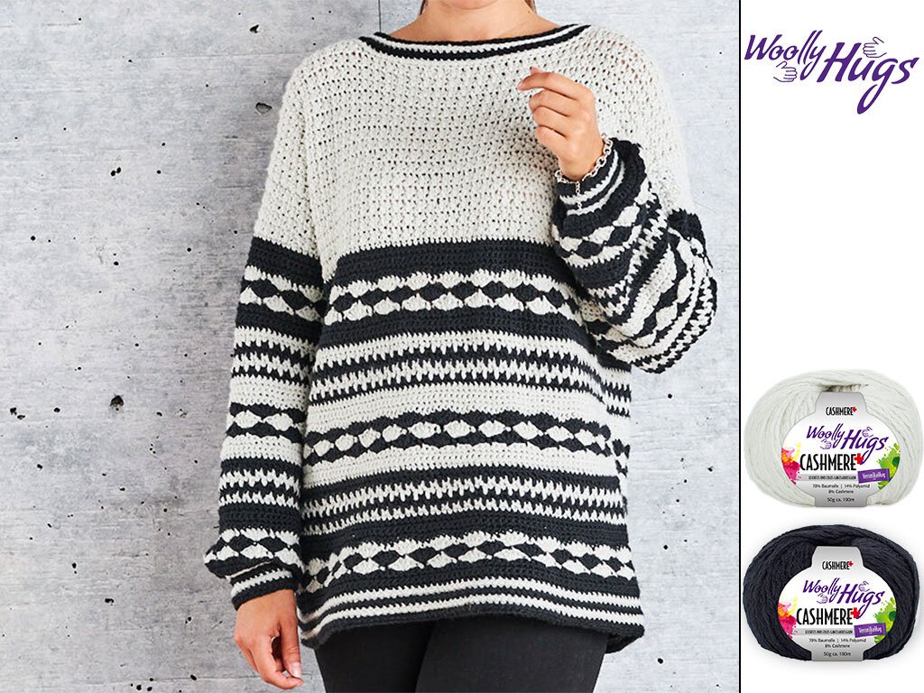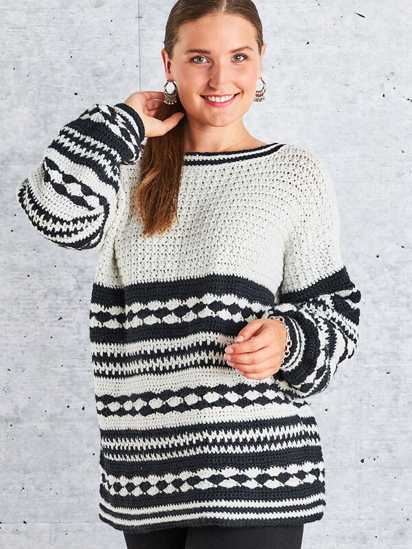 Häkelpullis sind etwas für Omas? Auf keinen Fall! Dieser hier ist flott und sportlich und passt zu jedem Alter. Das Garn ist herrlich weich und mit Nadelstärke 4,5-5 auch schnell gehäkelt.