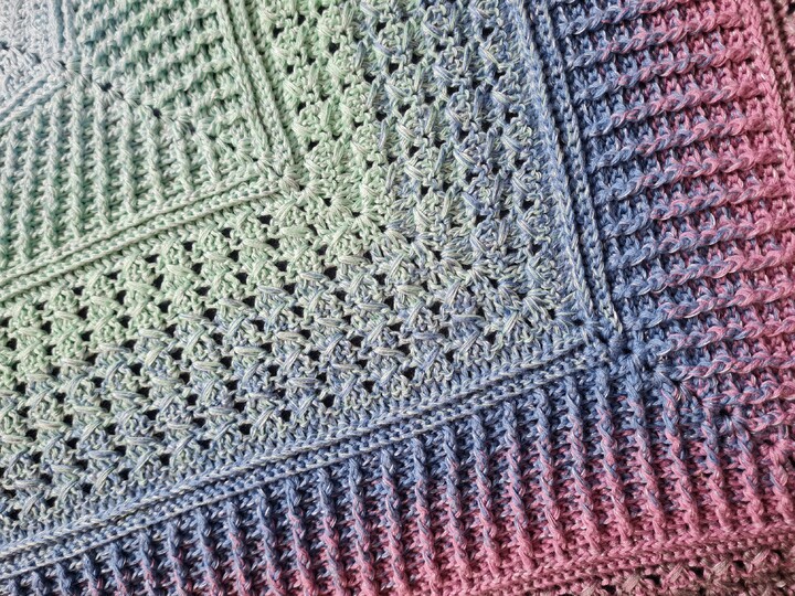 Bei Farbverlaufsgarn empfehle ich je nach Wunschgröße und Häkelstil eine Lauflänge ab 1400 4-fädig und eine dazu passende Nadelstärke.
