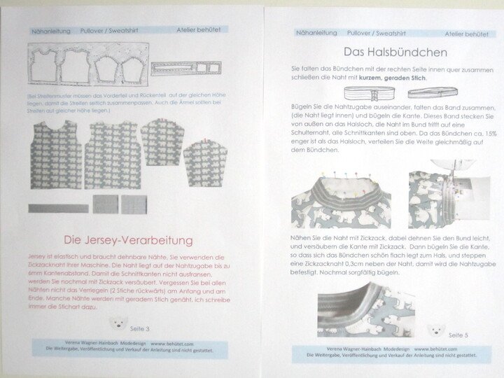 Im Schnittmuster sind die 7 Einzelgrößen 92, 98, 104, 110, 116, 122 und 128 in unterschiedlichen Farben eingezeichnet. Die Schnittteile sind größer als ein DinA4-Blatt und unterteilt, Sie setzten sie an den vorgesehenen Linien zusammen.