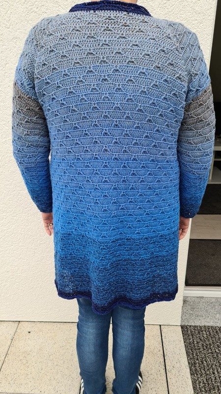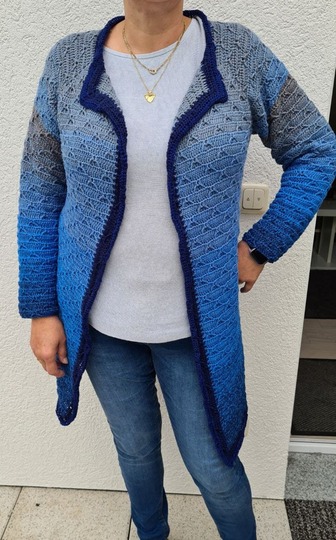 Gr. 36 ca. 1640m, 4fädig, NS 3,0 Verbrauch: Korpus ca. 1000m, Taschen je ca. 120m, Ärmel je ca. 200m, Umrandung ca. 200m