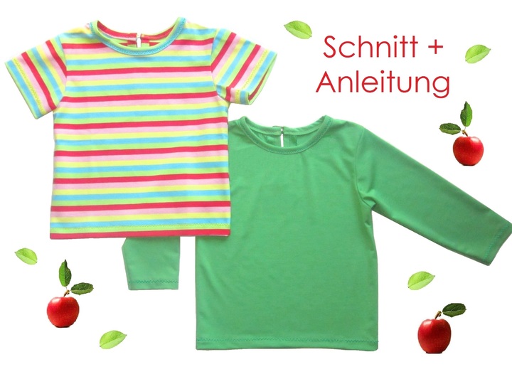 Schönes klassisches T-Shirt für Babys und Kleinkinder, das man durch den kleinen Schlitz hinten am Halsausschnitt leicht über den Kopf ziehen kann, mit Langarm und Kurzarm-Variante. Der Schnitt ist ganz einfach und auch für Streifen geeignet.