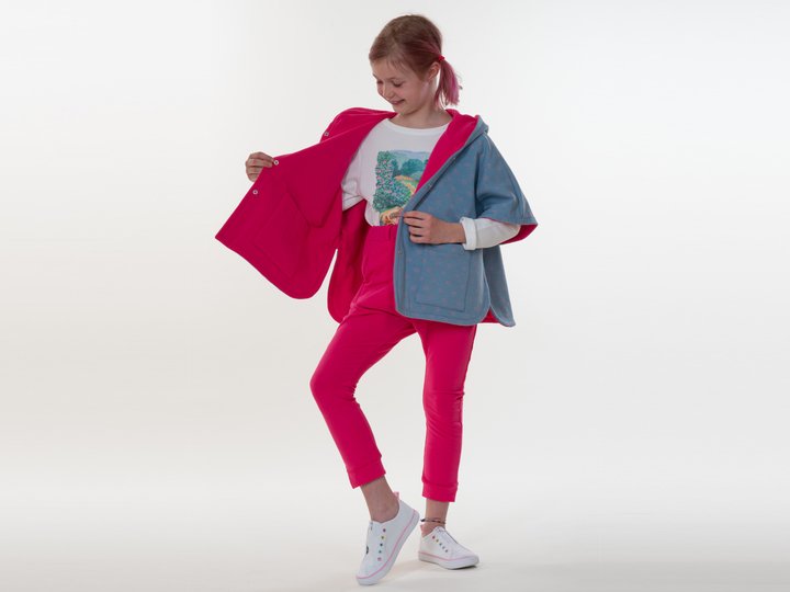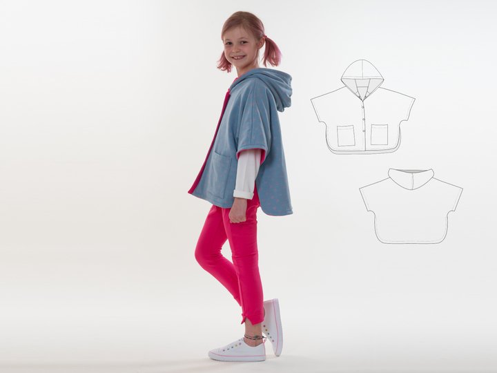 Mit diesem digitalen Schnittmuster nähst du den kuscheligen Mädchen-Poncho PAULA als gefüttertes Wende-Cape mit Kapuze und Taschen. PAULA ist ideal für Übergangszeit, Herbst und Winter und hält schön warm, ohne die Bewegungsfreiheit einzuschränken. Durch die Wendefunktion entstehen zwei Looks in einem – perfekt, um Stoffe und Farben zu kombinieren.
