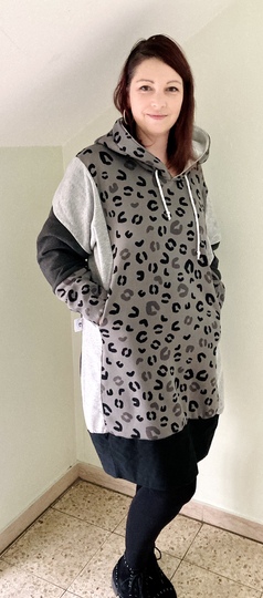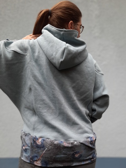 Eine Kapuze ist ebenso wie ein hoher und ein flacherer Kragen im Schnitt enthalten.
