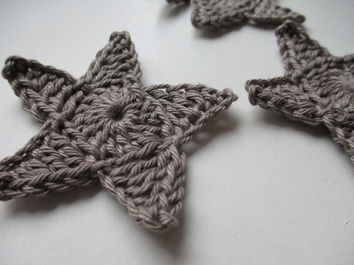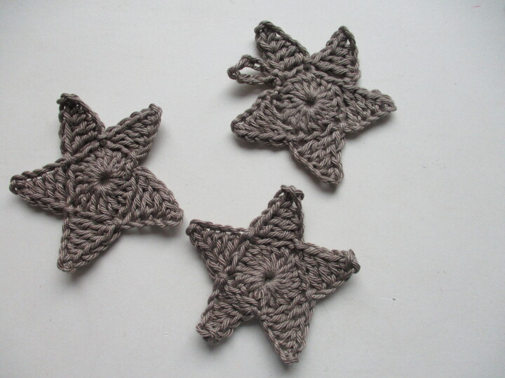 Die fertigen Sterne haben einen Durchmesser von ca 7cm. Dies kann natürlich etwas variieren je nachdem welche Wolle Du nimmst und wie fest oder locker zu häkelst.