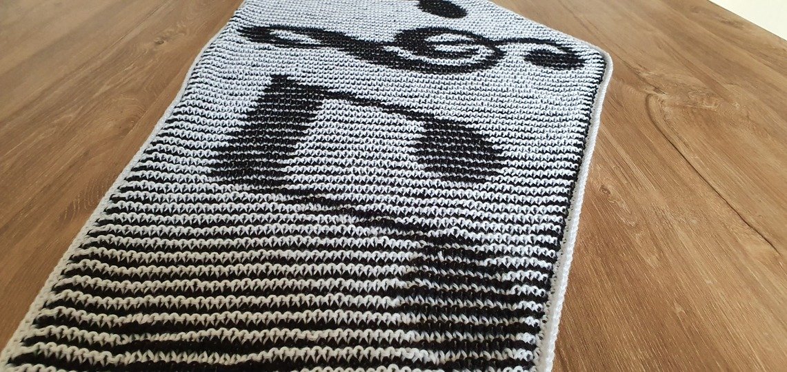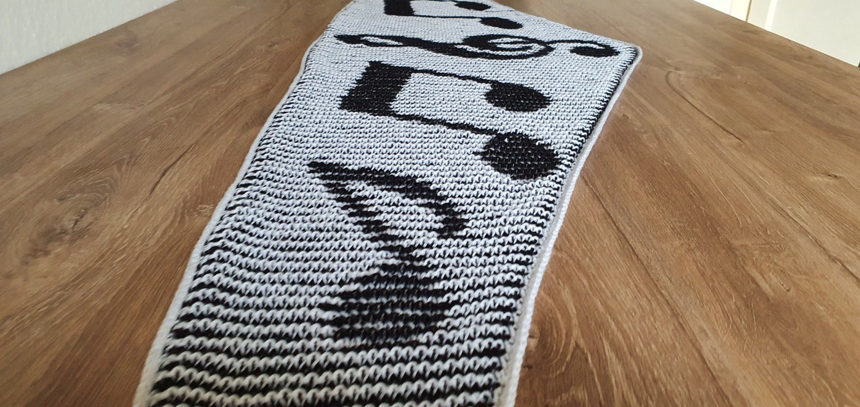 Gestrickt wurde das Tuch mit einem Violinschlüssel in der Mitte. In der Anleitung ist aber auch noch die Variante des Tuches mit einem Bassschlüssel in der Mitte, das habe ich aber nicht selbst gestrickt, deshalb gibt es dazu keine Bilder.