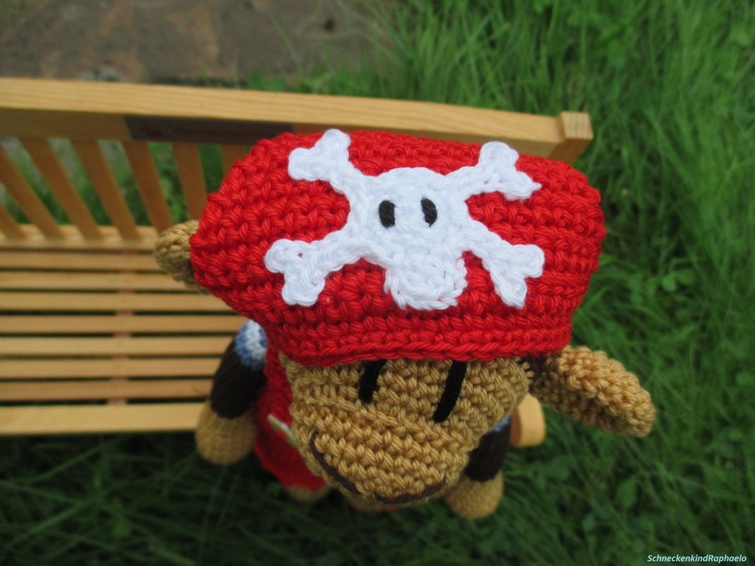 Ausführliche und gut bebilderte Häkelanleitung für den kleinen Piratenaffen Jack inklusive Hose & Bandana.