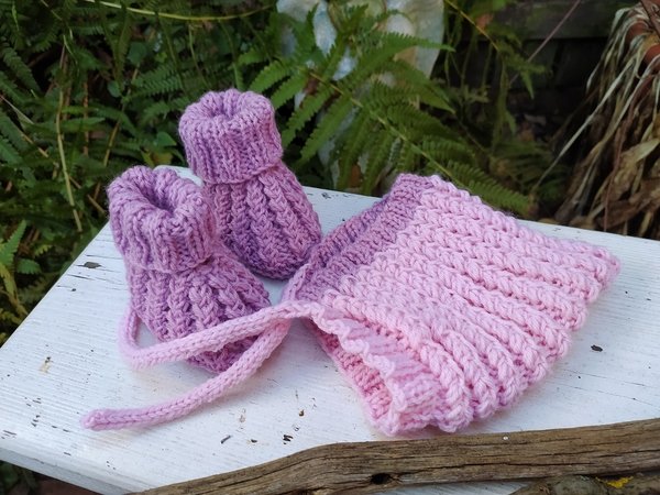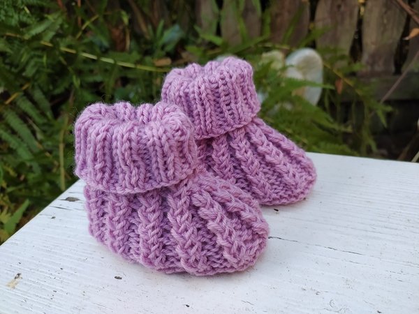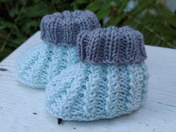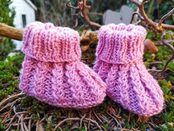 Strickanleitung für Babyschuhe mit einem außergewöhnlichen Muster. Das Muster entsteht durch Umschläge und zusammenstricken von Maschen. Es ist ein sehr festes Muster, aber elastisch wie ein Bündchenmuster.