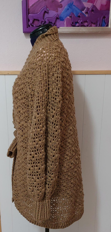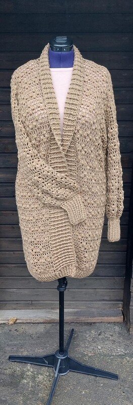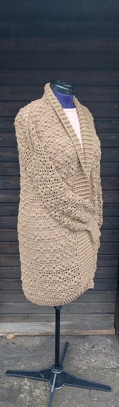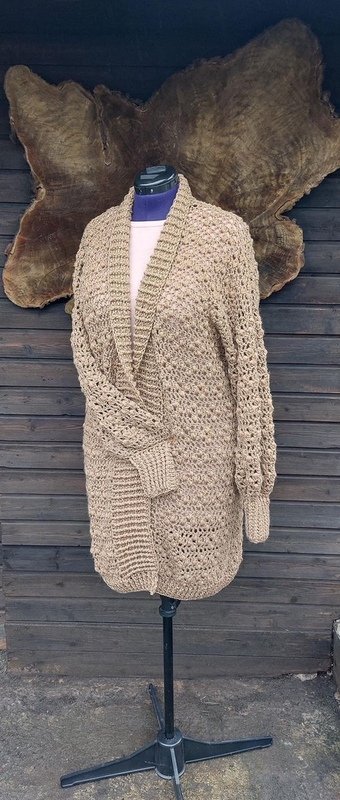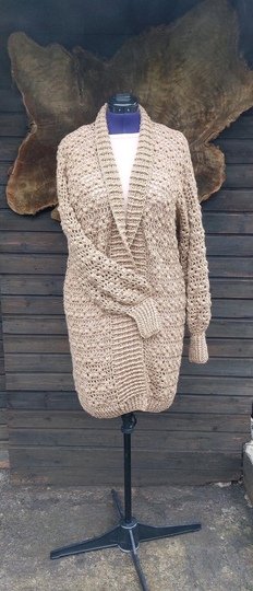 Die beige Jacke wurde aus einem 1000 Gramm Kone gemacht (94% Merion, 6% Nylon) und ist Größe 46/48.