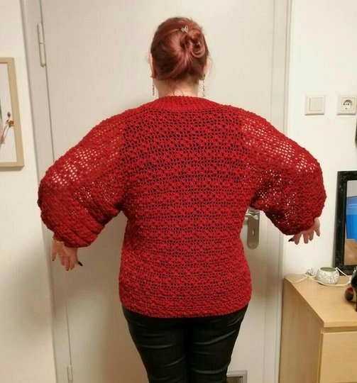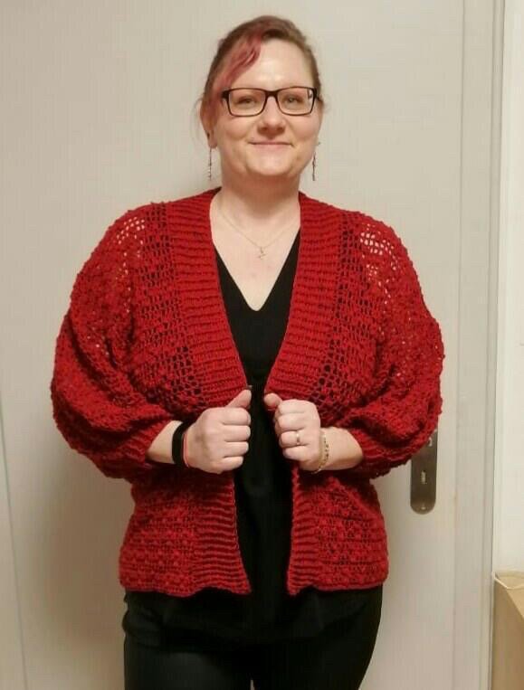 Alternativen: Die rote Jacke wurde mit einem Bobbel in Größe 44/46 gehäkelt, Verbrauch ca. 1900 Meter.