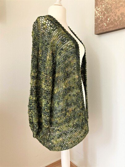 Durch die enthaltene Maschenprobe und diverser Tipps kann die Jacke aber auch an andere Größen angepasst werden.