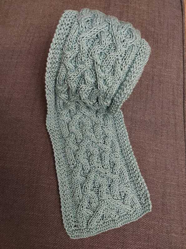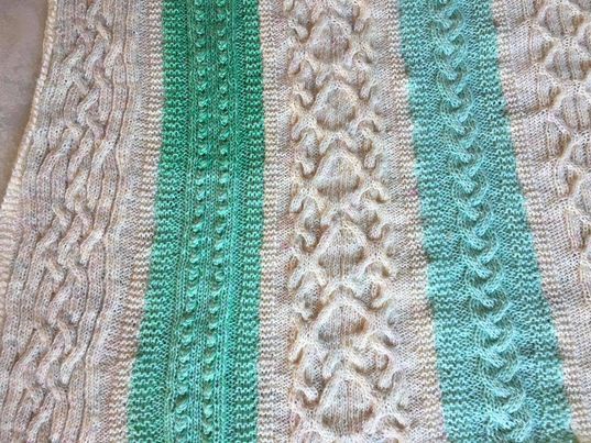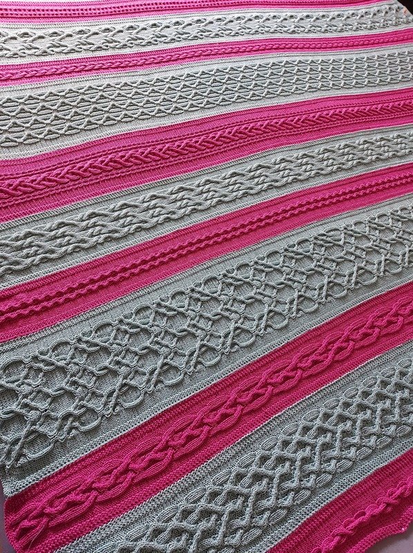 Die Decke besteht komplett aus gestrickten keltischen Zopfmustern und wird in Bahnen gestrickt, die am Ende zusammen genäht werden.