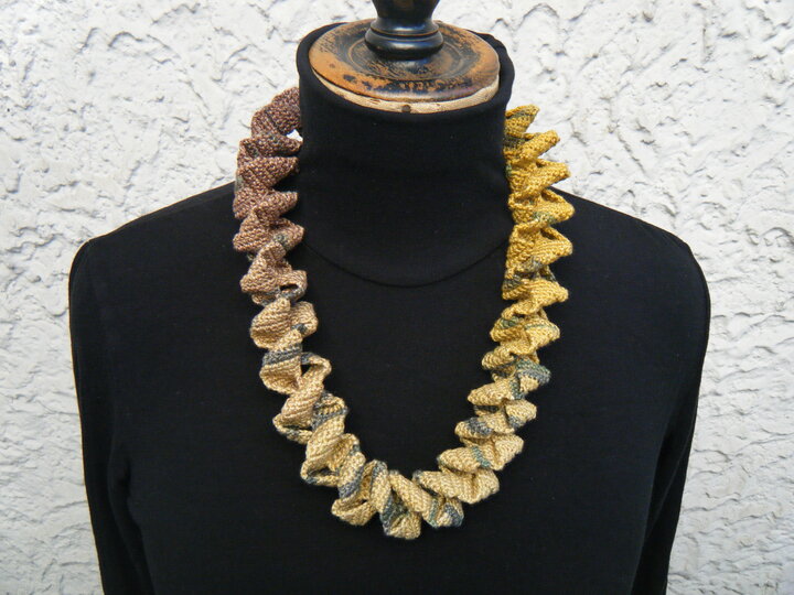 Die Kette kann in jeder beliebigen Länge gearbeitet werden und eignet sich auch hervorragend um schöne Garn- und Wollreste zu verarbeiten.