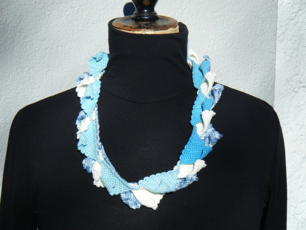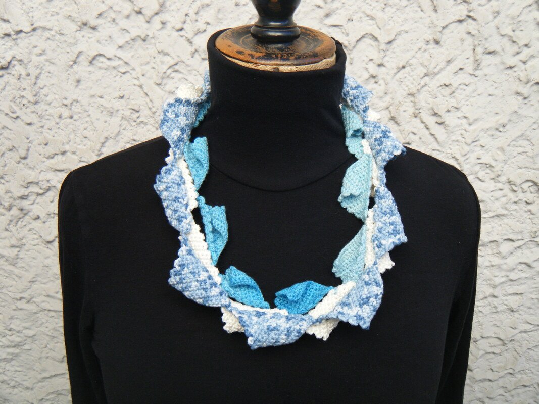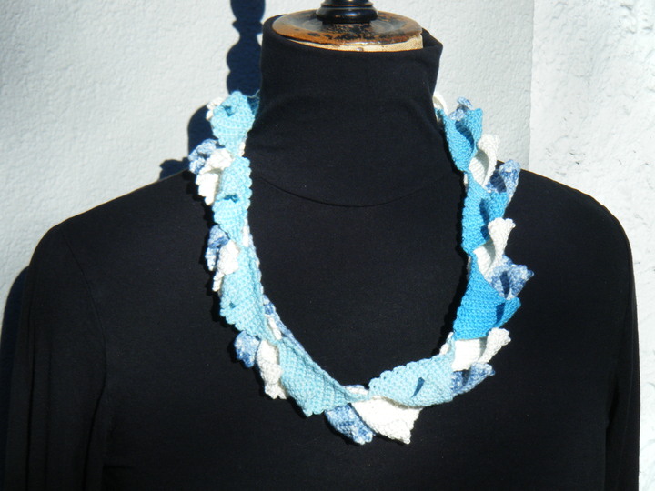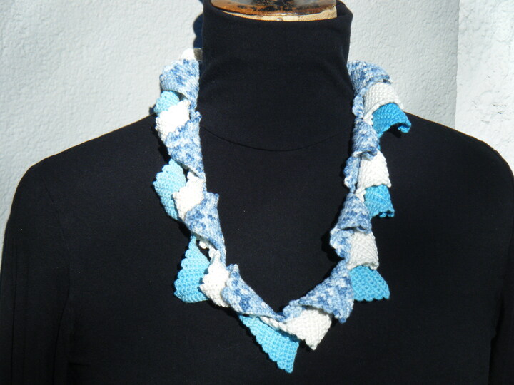 Verwenden Sie Ihr Lieblingsmaterial. Rustikale Wolle oder sommerliches Garn oder elegante Seide oder glamouröses Lurex. Die Kette kann in jeder beliebigen Länge gearbeitet werden und eignet sich auch hervorragend um schöne Garn- und Wollreste zu verarbeiten.