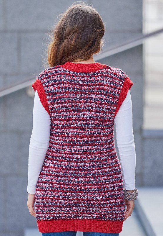 Dieser trendige Pullunder - oder auch Slip-Over genannt - ist ein herrlicher Kombipartner. Sportlich zu schmalen Hosen, elegant zu weich fließenden Röcken oder mit Bluse statt Shirt drunter lässt sich der Stil immer wieder verwandeln. Noch dazu ist so ein Pullunder mit Nadelstärke 6,5 schnell gestrickt und das Muster bietet Abwechslung, ist jedoch eingängig und nicht schwer. Für die besondere Wirkung wird hier mit zwei Fäden gleichzeitig gestrickt, wobei in der angegebenen Streifenfolge in jeder zweiten Reihe eine Farbe gewechselt wird. Im Zusammenspiel mit dem Muster aus Hebemaschen ergibt sich so die interessante, dabei immer harmonische Farbwirkung. Tipp: aus Baumwolle gestrickt wird aus dem Pullunder ein tolles Sommertop!