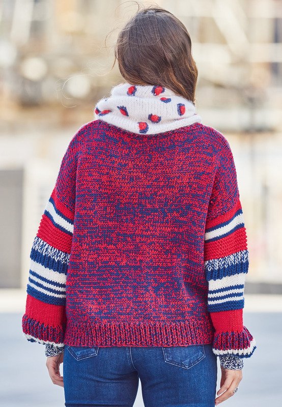 Die Coolness dieses Sweaters ist kaum mehr zu toppen. Super trendig der Melange Look, der dadurch entsteht, dass einfach mit zwei Fäden unterschiedlicher Farben zeitgleich gestrickt wird. Dazu wild gestreifte Ärmel und ein lockerer, weiter Schnitt. Mit Nadelstärke 6 wird das nicht nur ein recht schnelles Strickvergnügen, sondern auch ein absolut angesagtes – denn Grobstrick ist nach wie vor groß im Trend. Sowohl Vorder- und Rückenteil werden nach dem Bündchen bis zum Ausschnitt einfach gerade hoch gestrickt, auch die Ärmel kommen hier in angesagtem geraden Schnitt für einen gemäßigten Boxy-Style. Das I-Tüpfelchen: der passende Loop. Hier wird mit einer Rundstricknadel immer im Kreis gestrickt, die Blenden in kraus rechts, das Mittelteil in glatt rechts. Für die Leoparden-Punkte werden dicke rote Noppen beliebig verteilt aufgehäkelt und in Blau mit Maschenstichen umstickt.