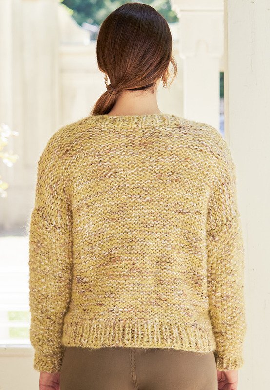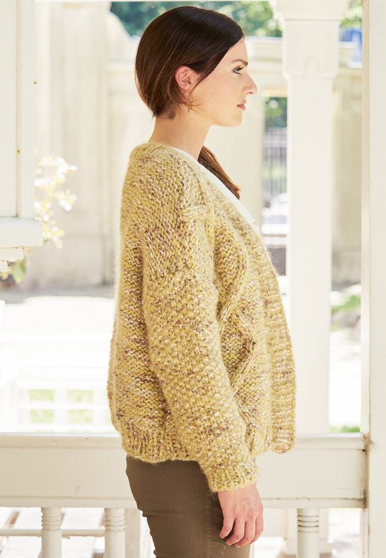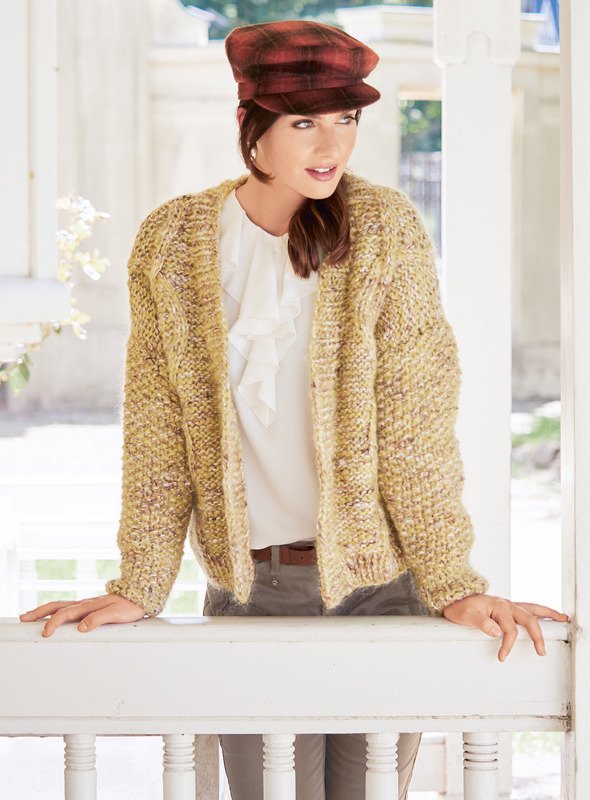Was für ein bezauberndes, kleines Jäckchen! Die Zopf- und Perlmuster, sowie die kraus links gestrickte Struktur dieses hüftlangen Jäckchens sind ganz klar an die klassische Trachtenmode angelehnt. Super modern wird es durch den Schalkragen, den Beilauffaden aus feinem Mohairflausch und die zarten Farben mit feinem Melange-Effekt.