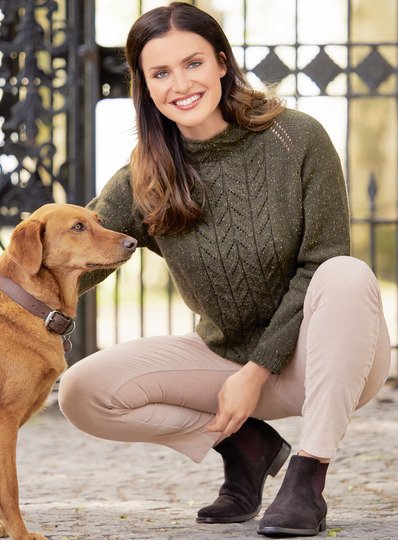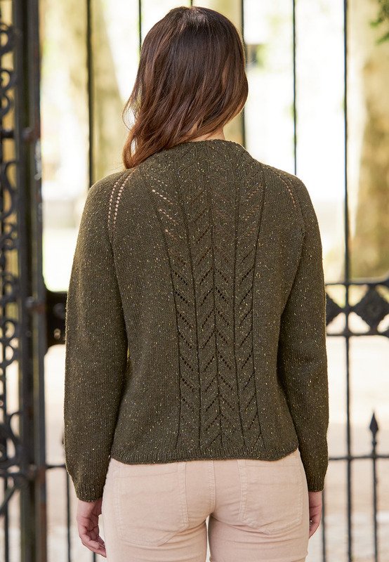 Der olivfarbene Pullover verdankt seine elegante Anmutung dem angeschnittenen Kragen und dem zarten Ährenmuster in der vorderen und hinteren Mitte. Die dezenten Farbeinschlüsse des Garns aus reiner Merinowolle in lila, gelb und grün geben ihm eine leicht rustikale Note und zaubern wunderschöne Kontraste. Gestrickt wird der Raglanpullover von oben nach unten, nahtlos in Runden. Man beginnt also am Kragen, strickt weiter mit Raglanzunahmen in Runden, bis die Maschen der Ärmel erst einmal stillgelegt werden. Weiter geht es immer im Kreis, bis der Pulli die gewünschte Länge hat. Danach werden die Ärmelmaschen wieder auf die Nadeln genommen und ebenso in Runden gearbeitet. Das zarte Muster besteht aus Umschlägen und zusammengestrickten Maschen, ist nicht schwierig und dank der übersichtlichen Strickschrift leicht nachzuarbeiten. Der Vorteil dieser nahtlosen Strickweise besteht einmal darin, dass es stets sehr angenehm und übersichtlich bleibt und man den Pullover auch immer zwischendurch anprobieren kann, um die Länge und Passform zu kontrollieren.