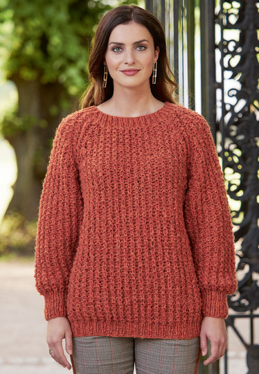 Wow! Der warme Orange-Ton des Garns bringt den lässigen Pullover in auffälligem Patentmuster zum Leuchten. Der voluminöse Schnitt und die dreifädige Verarbeitung von feiner Wolle und zartem Alpaka sorgen für unwiderstehlichen Wohlfühlfaktor an grauen Herbsttagen. Mit Nadelstärke 6,5 geht es auch mit den plastischen Patentrippen schnell voran. Der Pulli wird in vier Einzelteilen und im angesagten Raglanschnitt gestrickt. Sind Vorder-, Rückenteil und Ärmel fertig, werden die Raglannähte geschlossen und aus dem Halsausschnitt die Maschen für das schmale Halsbündchen aufgenommen. Ist auch dieses fertig, müssen nur noch die restlichen Nähte geschlossen werden und schon können wir uns stilvoll einkuscheln.