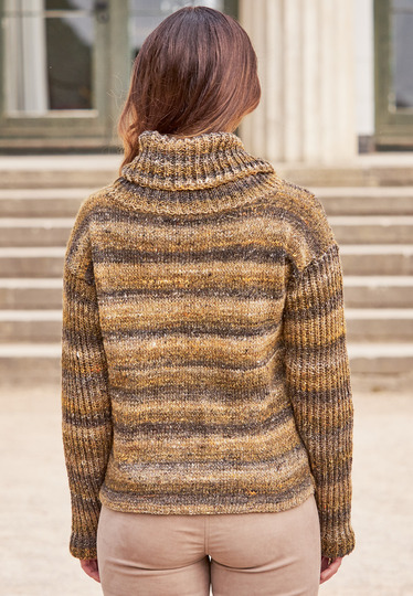 Tipp: Dieser Pullover erinnert uns mit seinem voluminösen, halsfernen Rollkragen und dem Farbverlaufsgarn in Brauntönen ein wenig an die Mode der 70er Jahre. Wer ihn originalgetreu stricken möchte, verlängert ihn um 15 cm und trägt ihn mit einem dünnen Gürtel zu Rock oder Schlaghose.