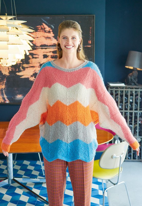 Was kann schöner sein, als sich in einen flauschigen, weichen Mohairpulli zu kuscheln, wenn die Temperaturen fallen? Besonders, wenn er leicht oversized ist, wie dieses Modell und mit dem Farbenmix auch noch gute Laune zaubert! Auch bereits das Stricken bietet hier jede menge Spaß-Potential. Weiches Garn in frohen Farben gleitet angenehm über die Nadeln und mit Nadelstärke 6 geht es zügig im leicht eingängigem Zackenmuster, bestehend aus Umschlägen, überzogenen Maschen und glatt rechts gestrickten Maschen voran. In den Rückreihen wird nicht gemustert. Da die Ärmel bei diesem Design gleich zusammen mit dem Vorder- bzw. Rückenteil gearbeitet werden gibt es auch nur zwei Teile zu stricken und auch die Ausarbeitung ist nicht sonderlich aufwändig: Nur die Schulter-Ärmelnähte schließen, aus dem Halsausschnitt die Maschen für das Rippenbündchen auffassen und zwei Runden stricken. Dann noch die 6 cm langen Ärmelbündchen ebenso auffassen und anstricken, die restlichen Nähte schließen und einkuscheln.
