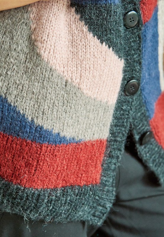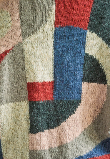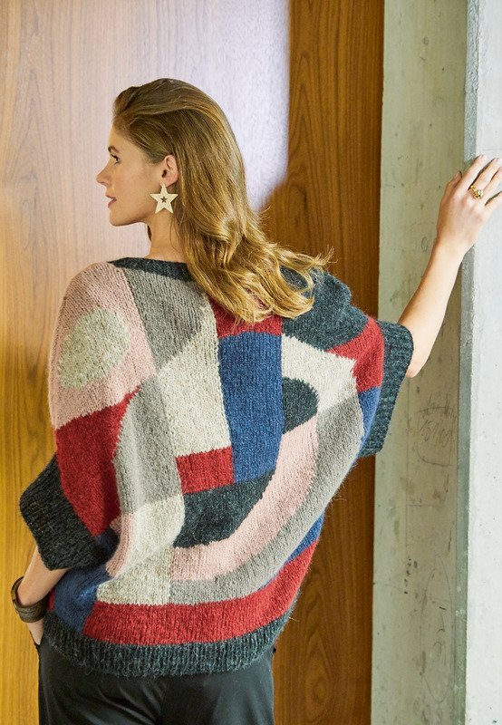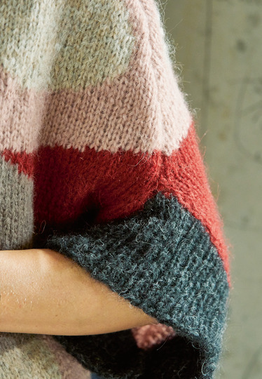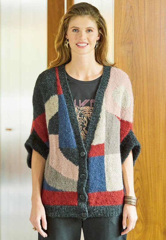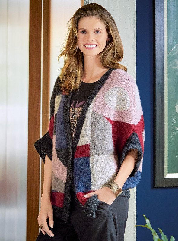 Bei dieser Strickjacke setzen sich geometrische Formen aneinander und spielen mit Farbharmonien. Besonders schön wirkt der Kontrast von Geometrie und flauschig weichem Garn aus Alpaka. Breite Bündchen ersetzen hier die Ärmel, die auf Höhe der Ellenbogen an Vorder- und Rückenteil angesetzt werden. Beide Vorderteile, sowie das Rückenteilwerden in der Intarsientechnik gestrickt, das heißt für jede Farbfläche wird ein extra Knäuel verwendet und beim Farbwechsel werden in jeder Rückreihe die Fäden auf der Rückseite miteinander verkreuzt. In dem übersichtlichem Zählmuster sind die entsprechenden Farbflächen klar unterteilt und leicht verständlich markiert – so bleibt der Überblick stets gewahrt. Das untere Bündchen wird bei allen Teilen gleich angestrickt, die langen Ärmelbündchen und die Blenden folgen erst nach Fertigstellung beider Vorderteile und des Rückenteils. Dafür werden aus den Kanten die benötigten Maschen herausgestrickt und die Blenden mit dem formgebenden Rippenmuster versehen. Auf der rechten Vorderteilseite werden hierbei auch gleich die Knopflöcher eingearbeitet. Dann nur noch die Knöpfe annähen und das warme, leichte Alpakagarn und das neue, stylishe Teil im herbstlichen Kleiderschrank genießen.
