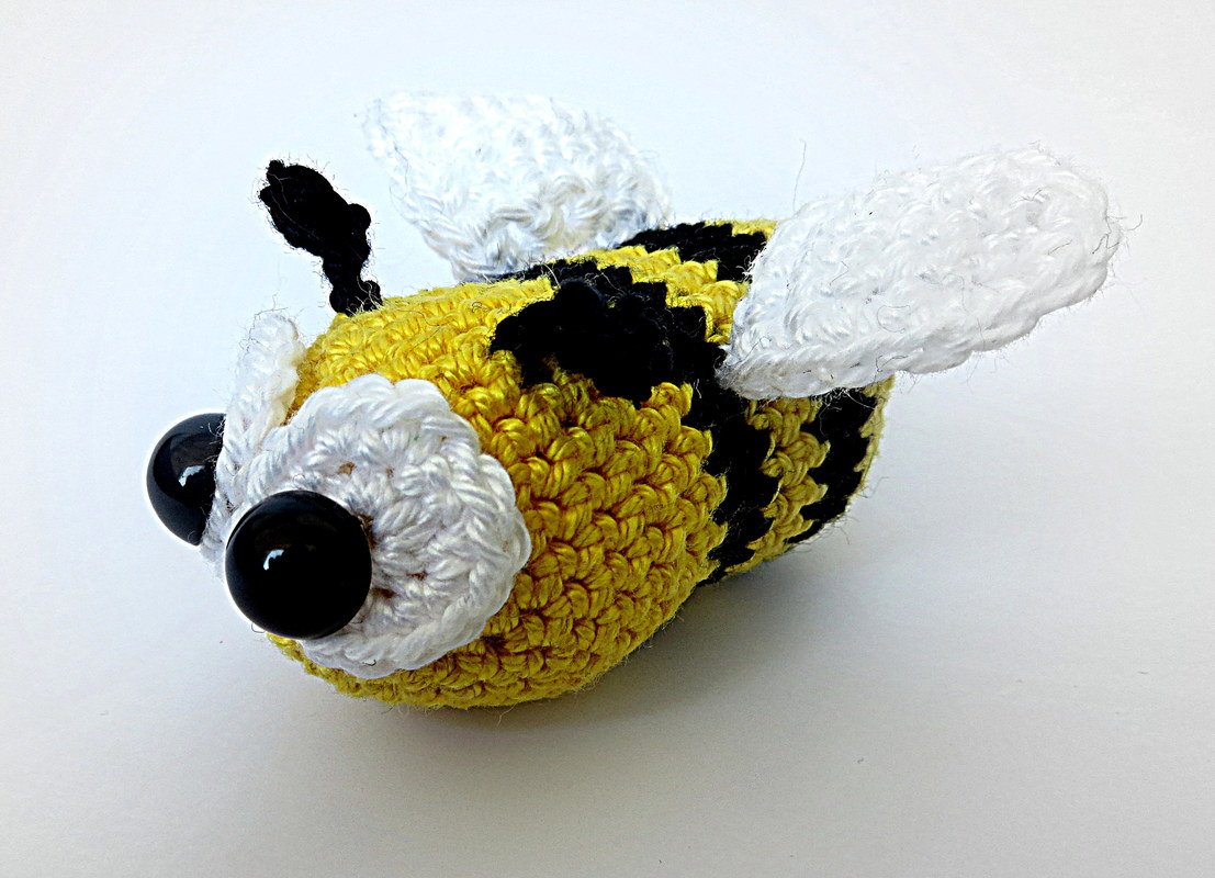 Die fertige Biene wird ca. 7cm lang. Natürlich kann die Größe variieren, je nachdem ob man fest oder locker häkelt. Auch die Wahl der Wolle ist entscheidend. Ich selbst häkle mit Apollo Baumwollgarn 125m/50g (100% Baumwolle).
