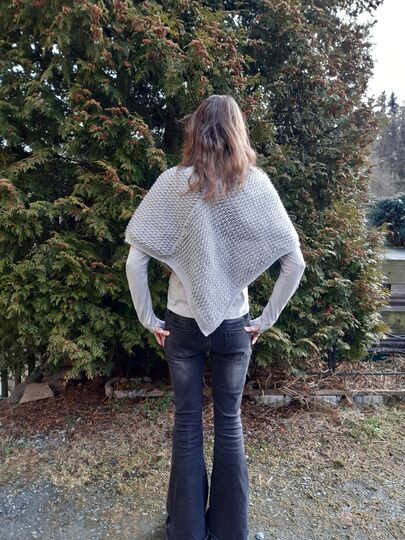 Mein Poncho hat, mit dem oben genannten Material, eine Länge (gemessen vom Halsausschnitt bis zur Spitze) von ca. 56cm.