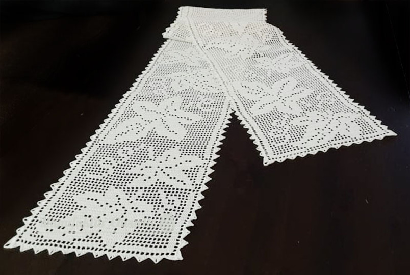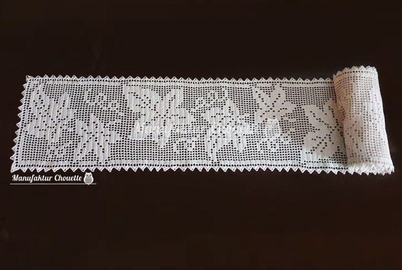 Es gibt ein Zählmuster mit Rapport und 2 Endvarianten. Da kannst Du die Länge des Tischbandes selbst bestimmen und auch mitten im Rapport enden. Der kleine Zackenrand erleichtert nicht nur das Spannen, er lässt das Tischband auch sehr zart wirken.