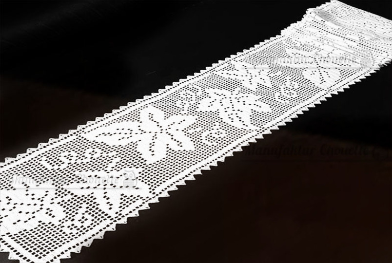 Für ein je 1m Tischband benötigst Du etwa 100 g Filetgarn Stärke 15 und Häkelnadel Nr. 1,25.