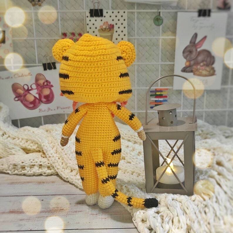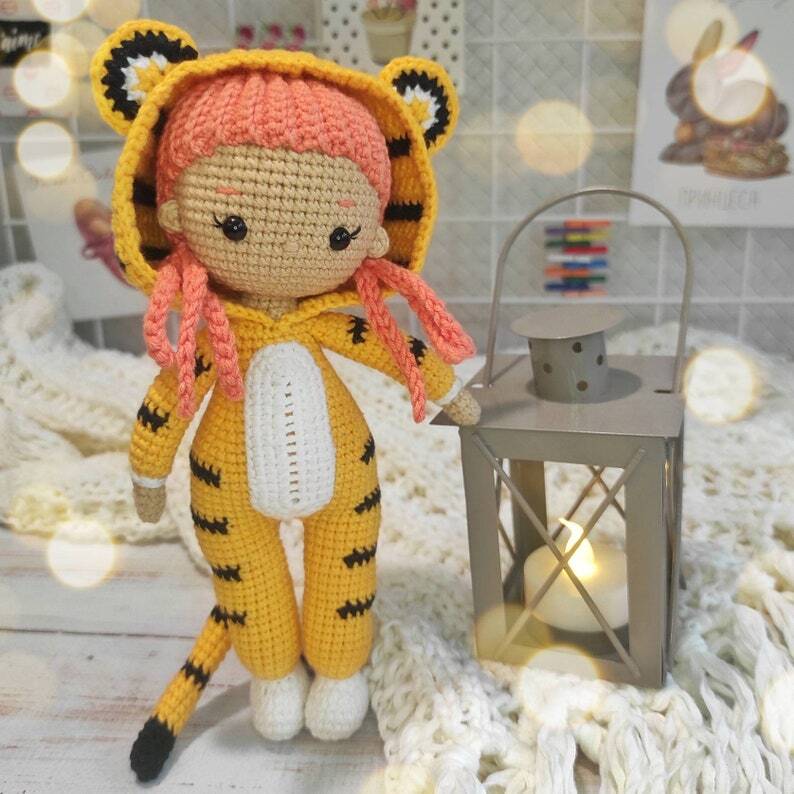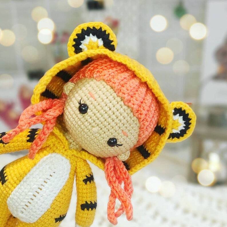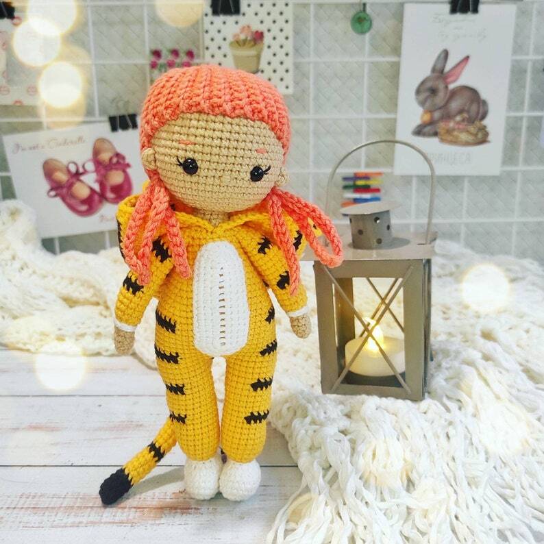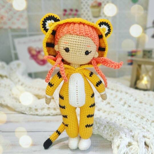 Verwendet man ähnliches Garn und eine Häkelnadel 2,25 mm, dann wird das kleine Mädchen ca. 18 cm groß.