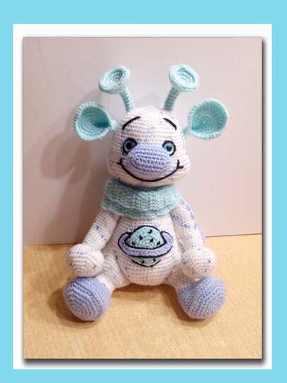 Ich habe Allwin das Alien mit einer Nadelstärke von 2,0 und dazu passender Wolle gearbeitet und es hat bei mir eine Größe von ca. 21 cm.