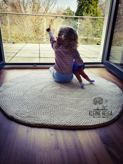 In der Anleitung liste ich dir das Muster bis einschließlich der Runde 23 genau auf. Ab da erkläre ich dir ganz genau, wie du dein Häkelstück unendlich größer machen kannst. So kannst du dann auch größere Projekte wie einen Teppich meistern :-).