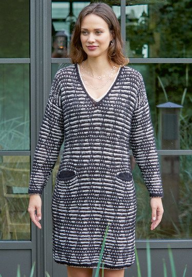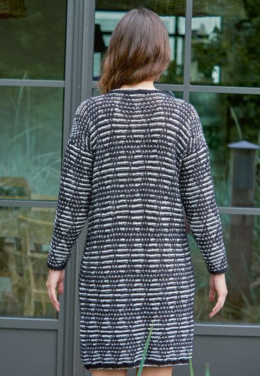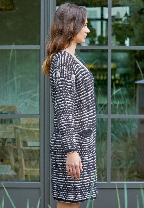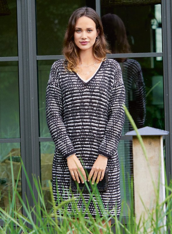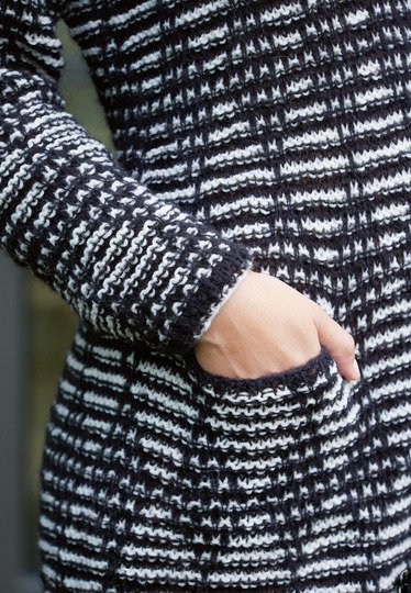 Zudem ist es mit seinem effektvollem Hebemaschenmuster in Schwarz und Weiß absolut klassisch und bietet auch noch jede Menge Strickspaß. Denn Hebemaschen sind nicht sonderlich kompliziert – entsteht das Muster doch ganz einfach durch das Abheben von Maschen. Allein dadurch lassen sich unterschiedlichste, raffinierte Muster realisieren.