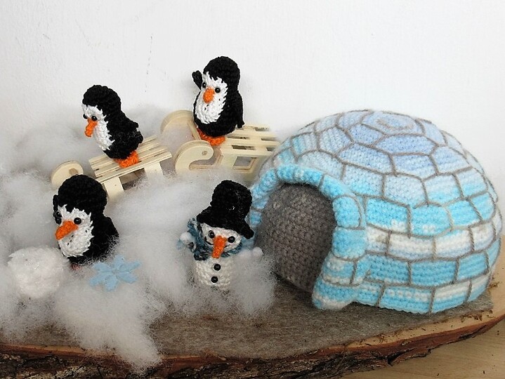Der Iglu hat einen Durchmesser von 15 cm, die Pinguine und der Schneemann werden mit dem angegebenen Garn ca. 5 cm groß.