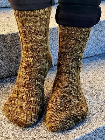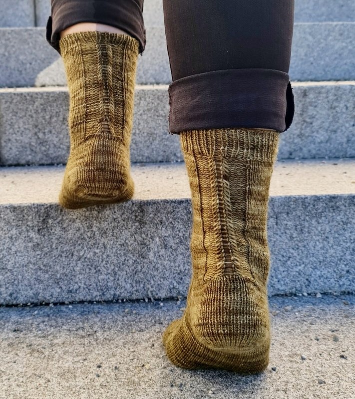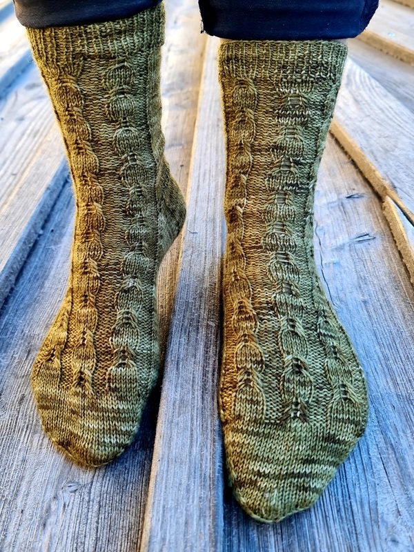 Die Socken DORINE bestechen durch das eingängige, aber dennoch effektvolle Muster, welches auf der Vorderseite des Fusses vom Bündchen bis zur Spitze hinabläuft. Aber die Socken können sich auch von hinten sehen lassen. Hier zieht sich vom Bündchen bis zum Beginn der Ferse ein Zopf-ähnliches Muster