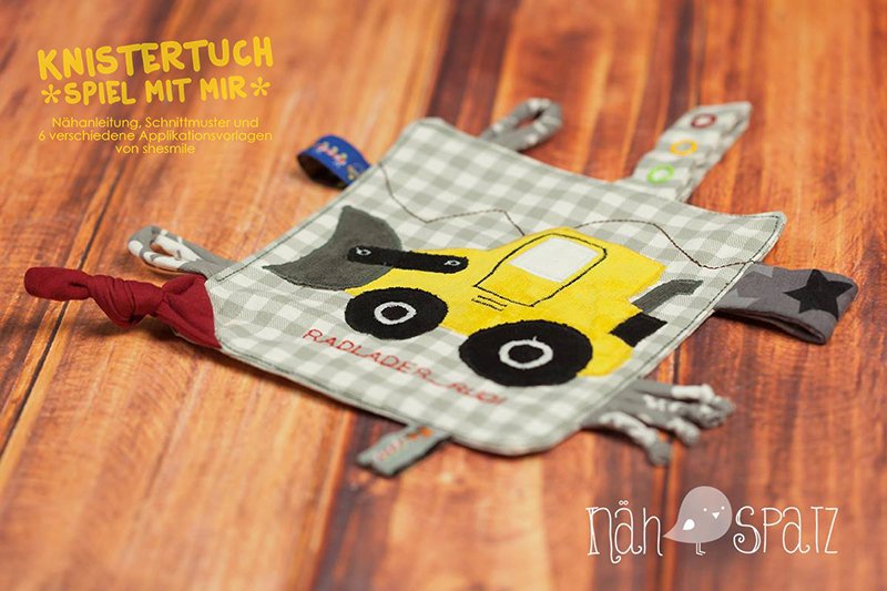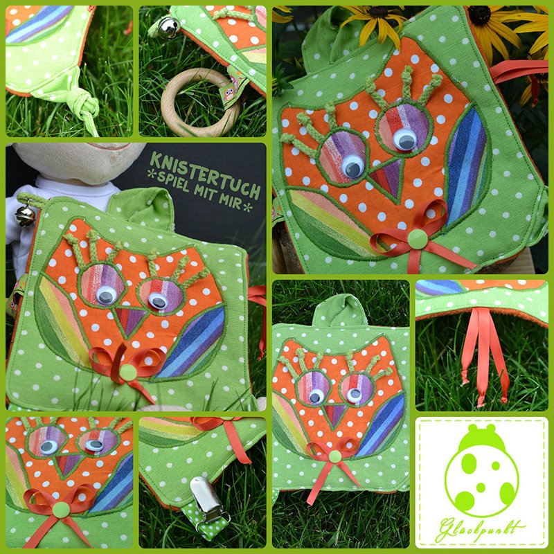 Nähanleitung und Schnittmuster gestaltet als PDF-E-Book für ein Knistertuch oder Spieltuch "Spiel mit mir" für Babys zum Fühlen, Beissen und Hören.