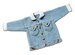 Material: 200 gr. Farbe Blau für die Größe 50/56, jeweils 50 gr. mehr für jede weitere Größe von Lambswool 51 von Phildar, 50gr./134m., 51% Merino, 49% Acrylic,, (Alternative: Merino Superfein, Cool Wool von Lana Grossa, 50 gr/160m oder preiswertere Alternative: Bravo Baby, 50 gr/184 m, 100% Polyacryl), 50 gr. Hellblau, Für Absteppungen: Wollreste, Farbe Hellbraun oder Orange, Häkelnadel: Nr. 2,5 und 3, 8-10 St. Knöpfe aus Metall, Durchmesser ca. 15 mm (4-6 für Knopfleiste, 2 St. für Knopfschlaufen unten 2 St. für Taschen), Hilfsmittel: dicke Nadel, dünne Nadel, Schere,
