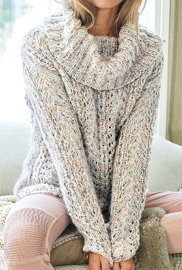 Gemütliche Oversizeformen geben uns ein Gefühl von Behaglichkeit, das wir jetzt im Winter gut gebrauchen können. Hier als Pulli mit Ajourstrukturen und voluminöasem Rollkragen. Das winterliche naturweiße Garn mit Einschlüssen aus Koralle und Flieder lässt sich wunderbar kombinieren und macht den Pulli damit zu einem Lieblingsteil für jeden Tag. Die Anleitung ist in Größe 38/40, 42/44 und 46/48.